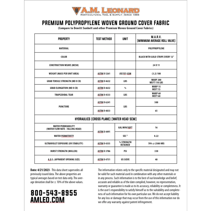 This woven ground cover conserves water by design, and is approved for most government weed control applications. Gold stripes are spaced every 1ft along length of the roll to allow for easy plant layout and container yard organization. UV stabilized polypropylene provides industry standard UV stability – 70% of original strength is retained after 2,500 hours of xenon arc testing exposure.