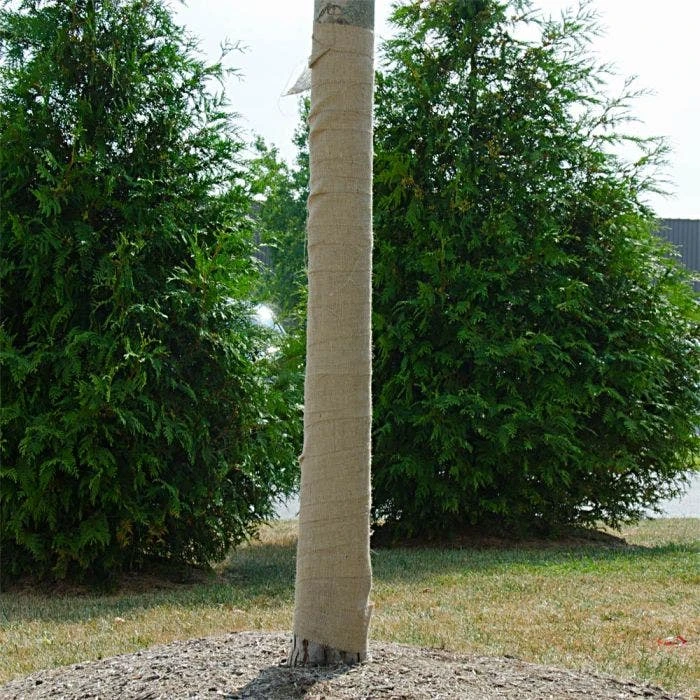 Quality burlap in 4-inch wide, 300-foot long. Non-adhesive. Simply wrap the tree and tie off, tuck, staple or use nursery nails to hold wrap in place. Handy and convenient.