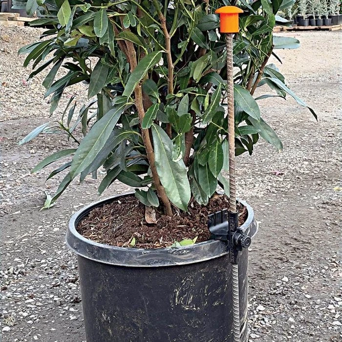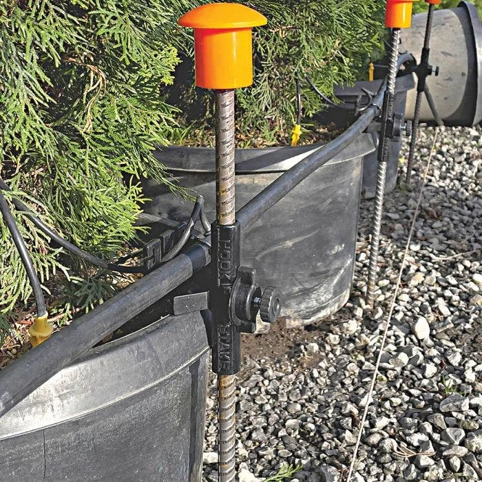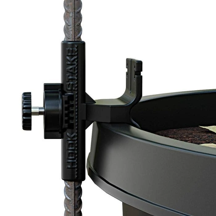 The HookStake secures potted plants to any round stake up to -inch diameter. Easily install with a single thumb screw, adjust and remove your potted plants quicker and easier than alternatives while also safely securing your irrigation system. Faster and more efficient crop rotation allows you to rotate and remove crops without any tools or pulling up any stakes while maintaining plant spacing and location. Secure and protects irrigation lines by keeping drip lines off the ground and reducing damaged parts and rodent damage. Drastically reduce plant damage and labor cost of picking up fallen plants. Fits pot sizes from 1 gallon to 50 gallon.