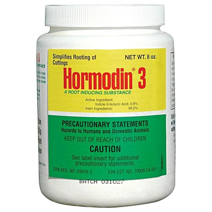 Hormodin #3 contains 0.8 active ingredient and is prepared specially for propagating the more difficult to root varieties, including many of the evergreens and dormant leafless cuttings (good for 17,500 cuttings). 0.5 lb jug.