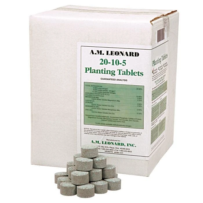 The Leonard Fertilizer Tablets for Tree Planting 20 10 5 Controlled Release 24 Months 5 grams contain slow release nutrition with a formula of 20 10 5. It also includes 2.2% magnesium, 2.5% iron, 2% manganese, and 0.18% zinc. The tablets have a 2-year nutrient release and are high in nitrogen.