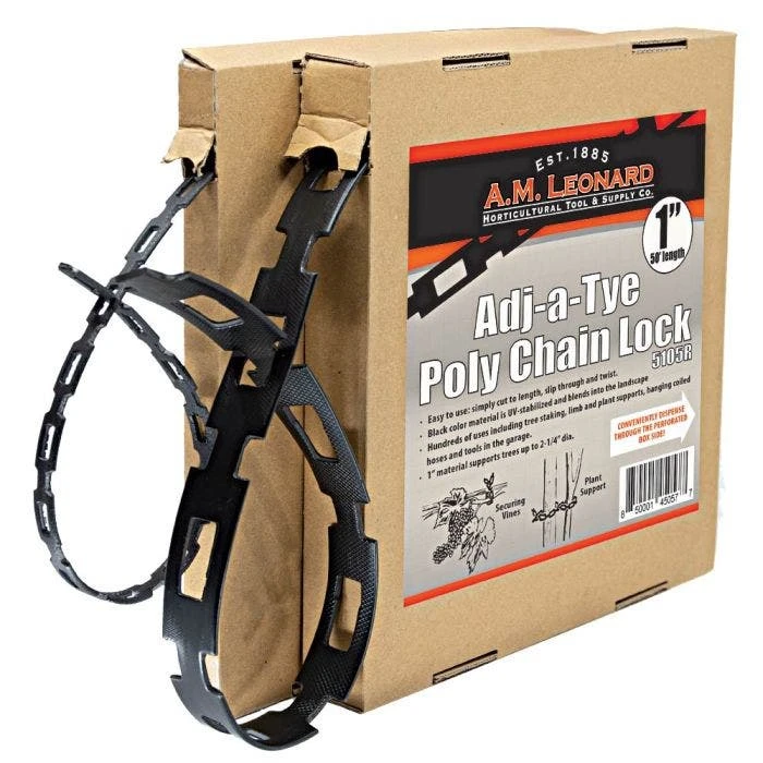 Leonard Adj-A-Tye Chain Lock has hundreds of uses. It is excellent for bracing overloaded fruit tree limbs. It makes staking easier than ever. The unique poly blend material makes this chain lock stronger and more rigid. This chain is less damaging to trees than other ties on the market. The convenient storage box dispenses the chain from the side, keeping the remainder neat and under control.