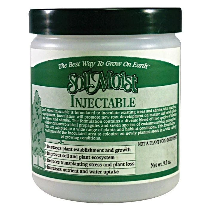 Soil Moist Injectable Watering Reduction Formula is a blend of beneficial mycor fungi, fertilizer, rooting hormones, vitamins, and sea kelp that is designed to promote root development and uptake ability of mature or newly planted trees and shrubs. It is also micronized to fight injector clogging, or can be used as a drench.