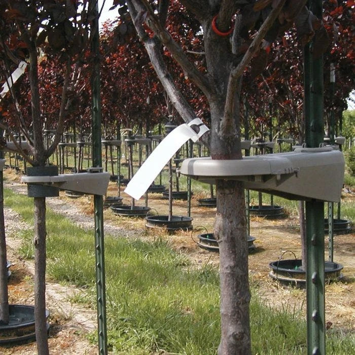 Use with T posts (not included) to support your trees. Allows some sway for best growth in the landscape, nursery and other applications. Telescopes from 10″ to 15″. Installs on either side of a T post (for one tree), or on both sides to hold 2 trees. Use in tandem to assist in straightening trunks. Cradle or cushion trunk with long-lasting EPDM rubber band (included) or Bark Saver (not included, #BS50). Recommended for trees up to 2″ in dia. and for above ground containers trees up to 15 gallons.