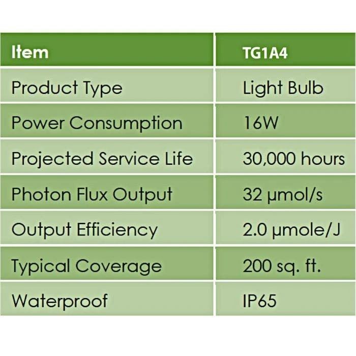The TotalGrow Pure Flowering 200 Lamp emits the perfect balance of red and far-red light. This waterproof, 16-watt LED bulb features a standard E26 bulb base. Unlike some other lamps, it contains no toxic heavy metals or thin glass.