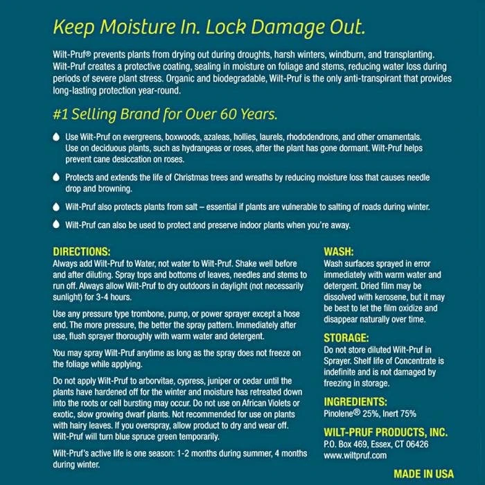 Wilt Pruf Anti Transpirant Plant Protection 1 Gallon Concentrate is the first anti transpirant on the market, which contains a film forming polymer. It offers high density, good efficacy and even coverage across foliage. It keeps trees, shrubs, sod, and indoor plants healthy and protected against plant damage due to winter kill, transplant shock, wind burn, drought, and air pollution.